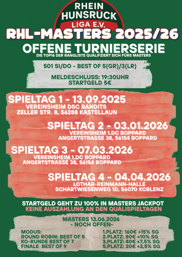 Die RHL-Masters ist eine offene Turnierserie für alle Dartbegeisterten – unabhängig von Vereinszugehörigkeit oder Spielniveau. Ziel ist die Qualifikation für ein großes Abschlussturnier, das sogenannte Masters, an dem die 16 besten Spieler:innen der Serie teilnehmen.